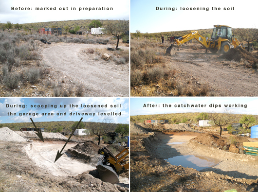 Big boys toysWhile Laurien was here we thought we'd give her the experience of having a bloomin big digger on site to see how quickly an area can be created for an earthship. Not that we're building another one, we're actually building a garage come workshop, but it'll be done in true earthship style with tyres and all. We already had the driveway but needed to lower it so it's level with the garage entrance. Thinking about Sep Holzer again we also made slight dimps in it to slow down the movement of water.